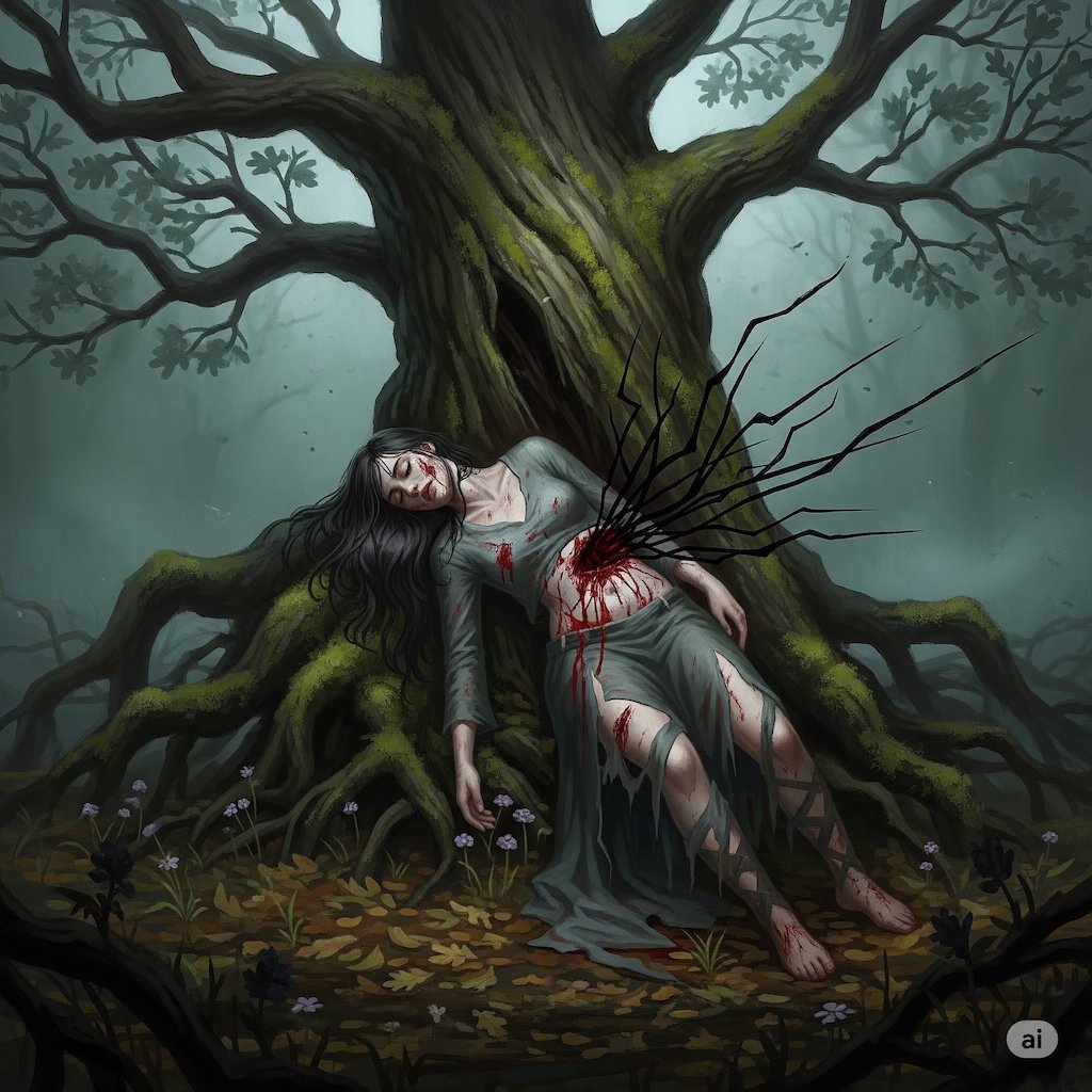 Lying slumped against a gnarled oak tree was a woman, her clothes torn and soaked with blood. She was unconscious, a gaping wound on her side.