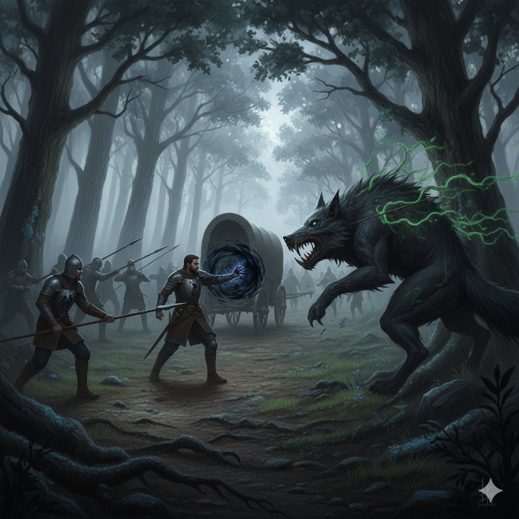 Just as the sun began to break through the cloud cover, the silence was shattered by a guttural snarl. A corrupted beast, a grotesque fusion of wolf and boar with sickly green tendrils pulsing from its hide, burst from the undergrowth. Its eyes glowed with the malevolent, chaotic energy that Revan had come to know all too well.